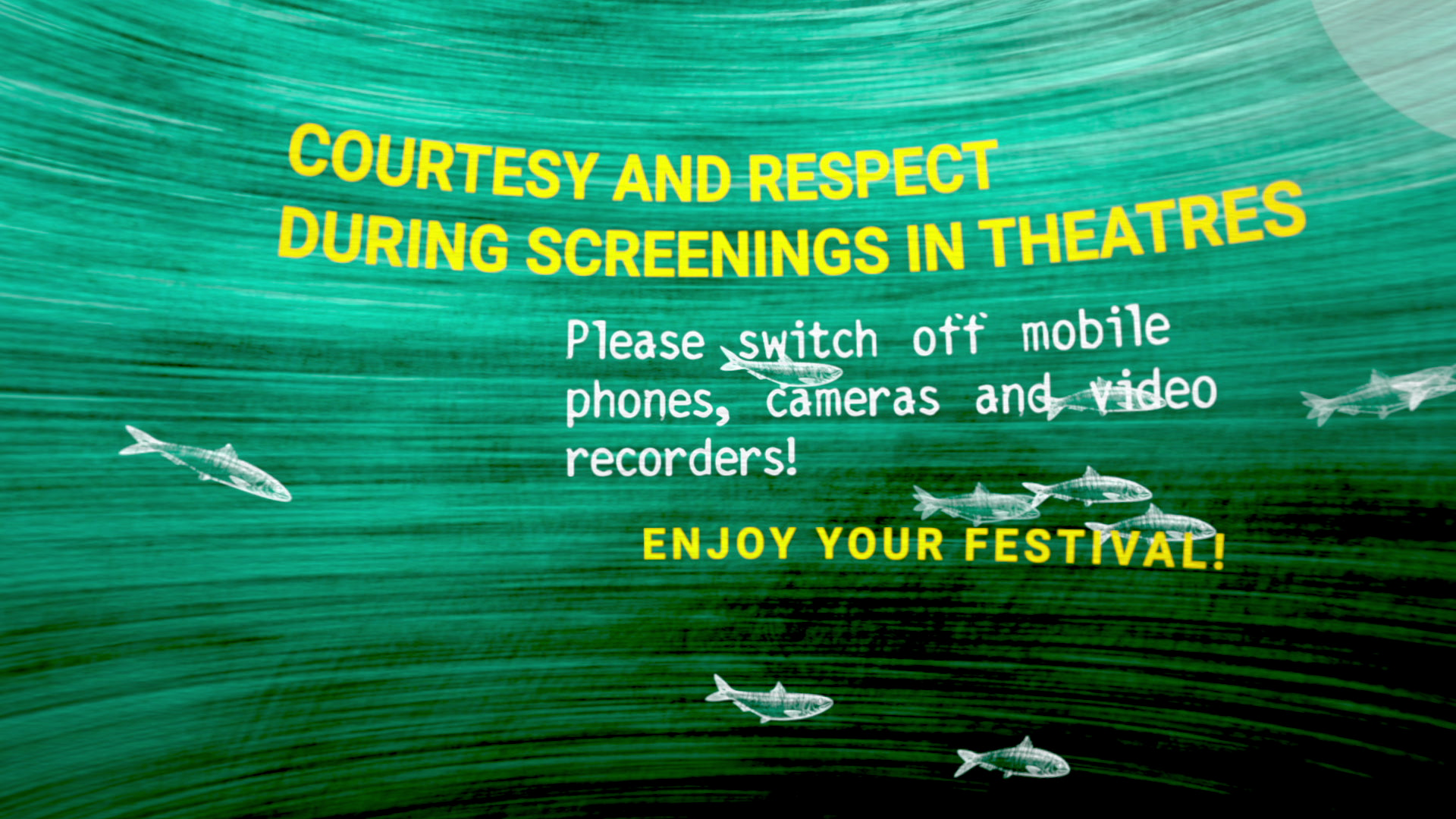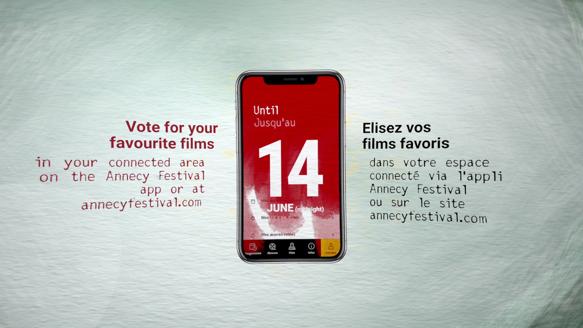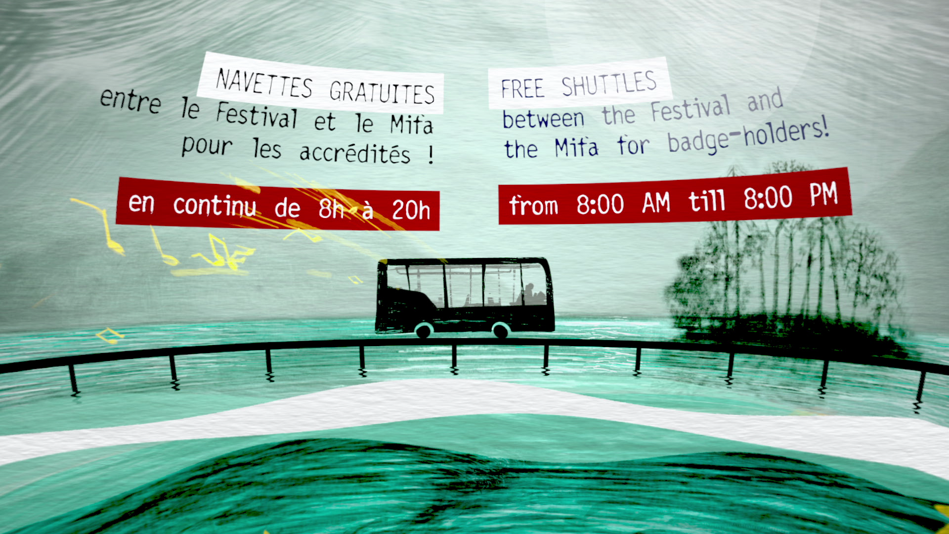 Nous avons réalisé 5 films informatifs (merchandising, navettes, comportement en salle, vote du public et vigilance piratage). Ils ont été déclinés à partir de l'affiche mais dans une atmosphère un peu différente, plus lumineuse et impactante pour favoriser la transmission tout en restant doux.