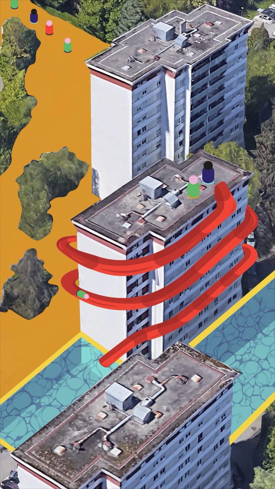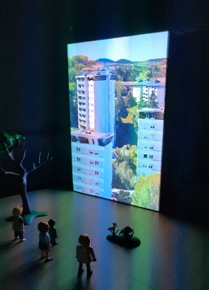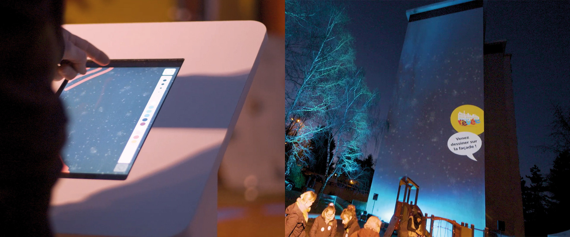Nous avons d'abord imaginé une projection interactive permettant aux habitants de dessiner directement sur les immeubles par l'intermédiaire d'une borne tactile accessible à tous.
